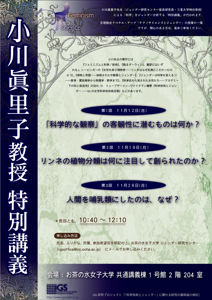 - 小川眞里子先生(ジェンダー研究センター客員研究員・三重大学特任教授)による「科学」をジェンダー分析する「特別講義」が行われます。