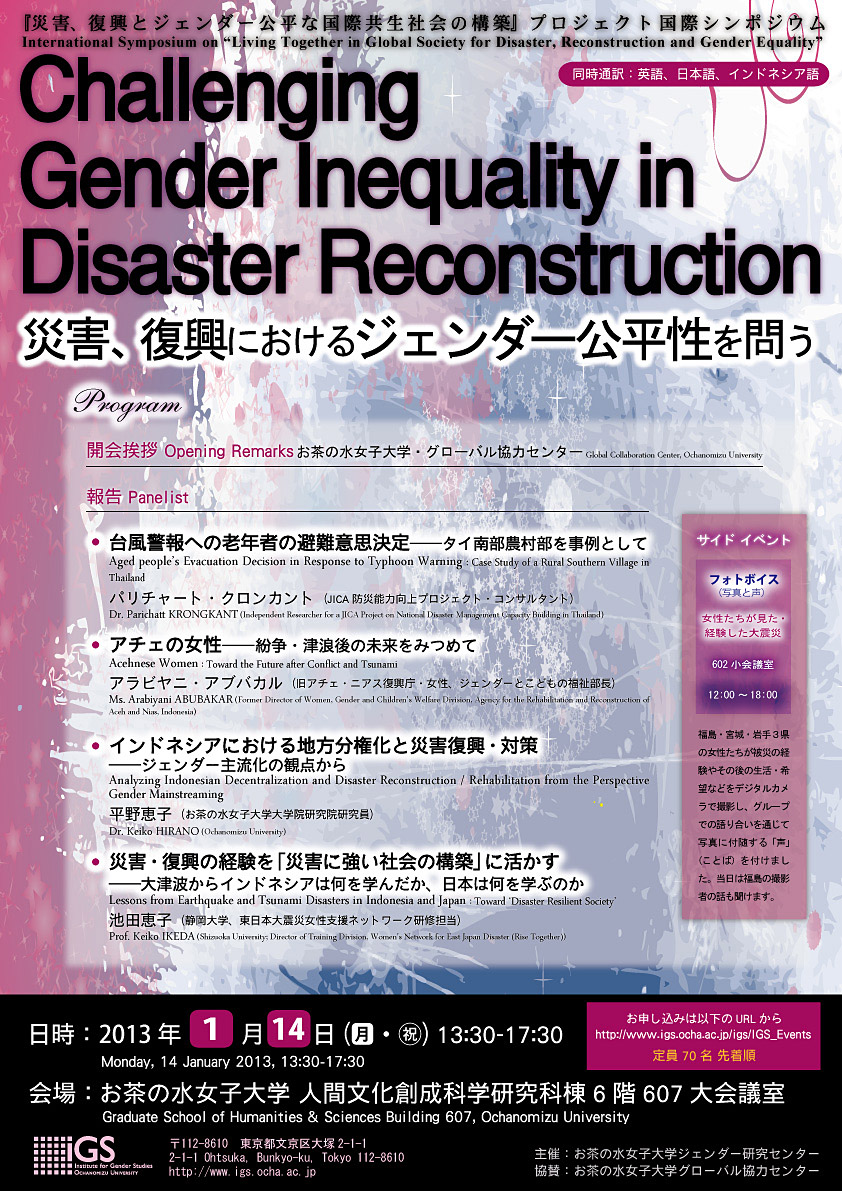 2013.1/14 国際シンポジウム「災害、復興におけるジェンダー公平性を問う」