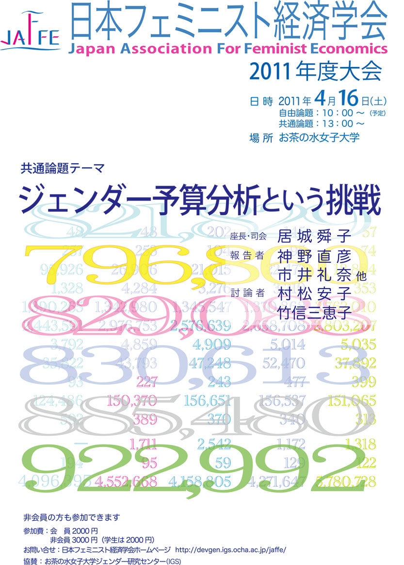 2011年度日本フェミニスト経済学会は、このような時期に、このような時期であるからこそ、今大会の共通論題となる、日本における財政と社会保障に対するジェンダー予算分析というテーマが、震災の収束が見えない只中にあって、またこの後の社会再構築において、最大の政治的経済的課題の一つであると考えています。今後の政策・制度設計において浮上するであろう安易な「復興」言説に抗する、様々な運動の声を具体的に反映していくための重要な礎となるものと認識し、今大会を行うことを決定いたしました。